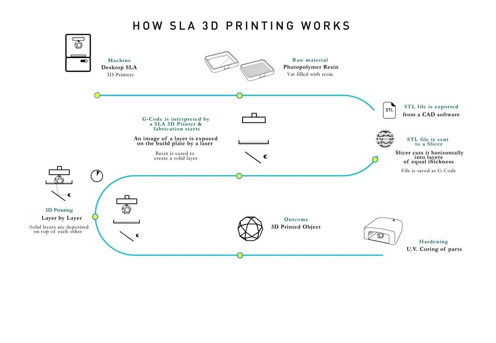 Welcome to Prototechnoworld3D, the premier manufacturer of Stereolithography (SLA) 3D printing technology. SLA is typically used when a great surface finish and dimensional accuracy in the order of microns is necessary. The raw material is often a liquid resin which polymerizes when laser or light is incident on it. Very fine and intricate features of a design can be thoroughly replicated using SLA. A variety of materials like ABS, Polycarbonate, Clear plastic, Dental resins, and Bio-compatible materials are also possible in the SLA process. Discover how our cutting-edge solutions can revolutionize your manufacturing processes, delivering unmatched precision, versatility, and efficiency.